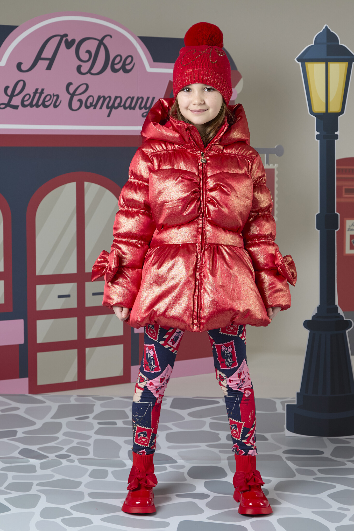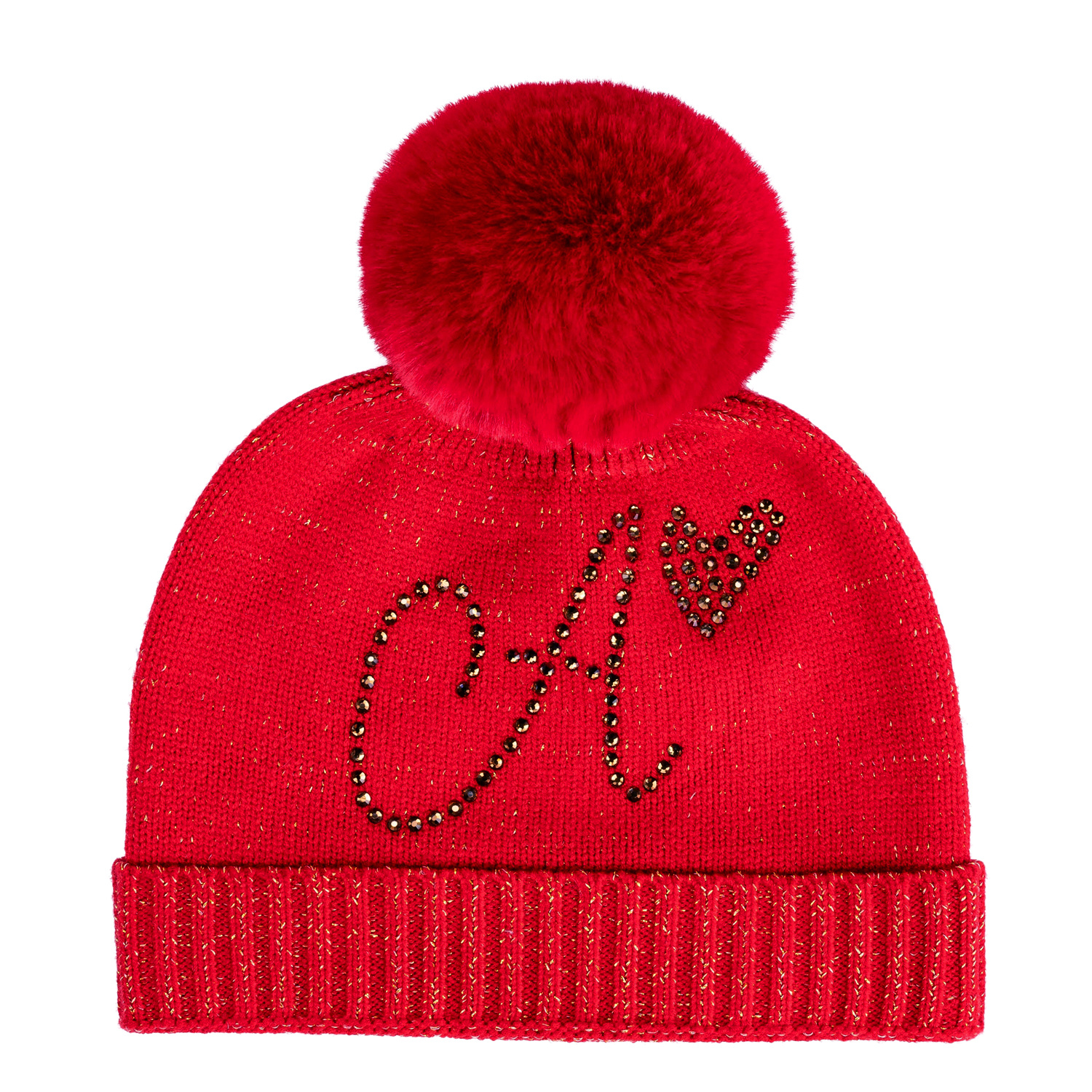 Knitted lurex hat with faux fur pom pom and diamante branded artwork
