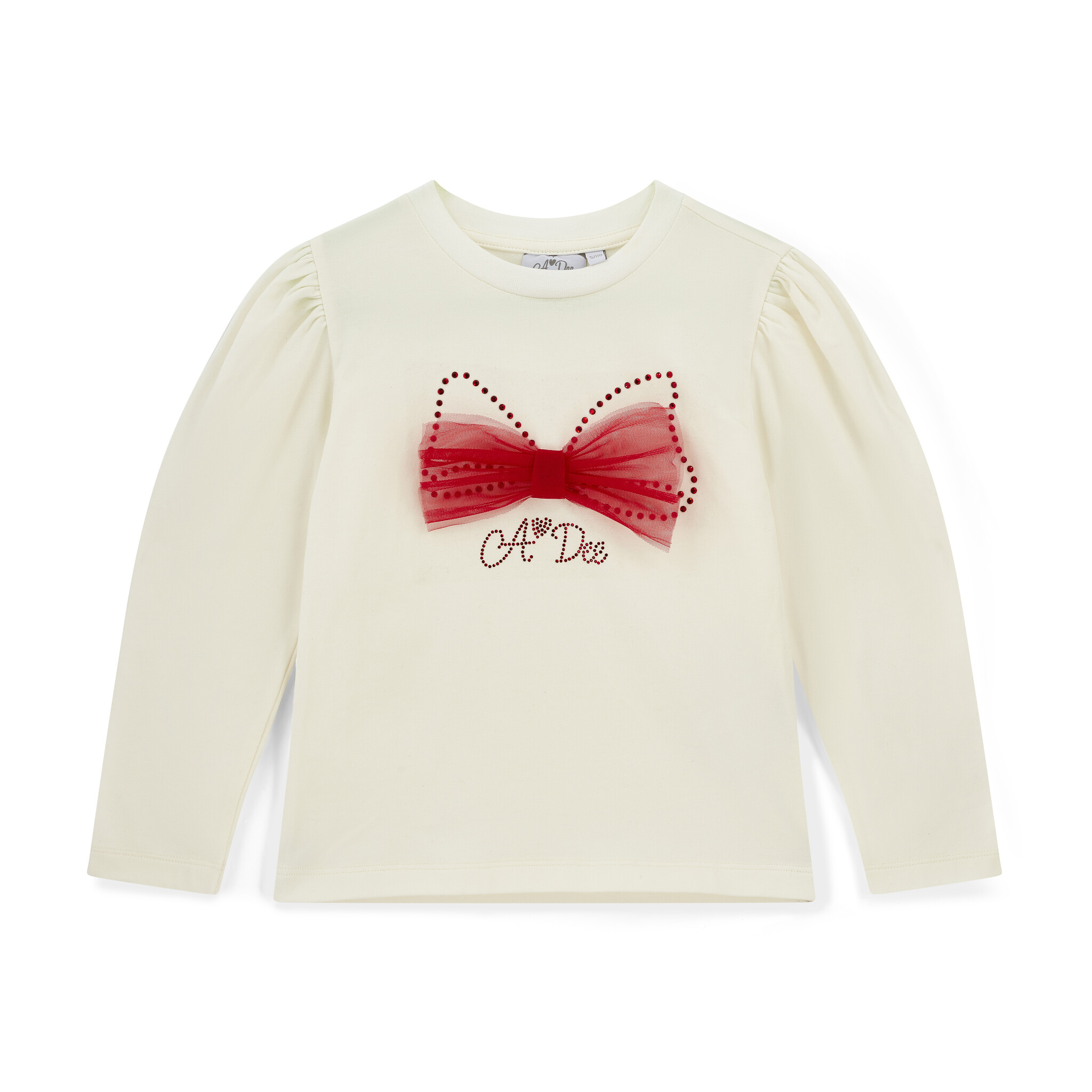 The Layla set includes a bold tulle layered skirt paired with a long sleeve jersey top with a cute tulle bow detail.