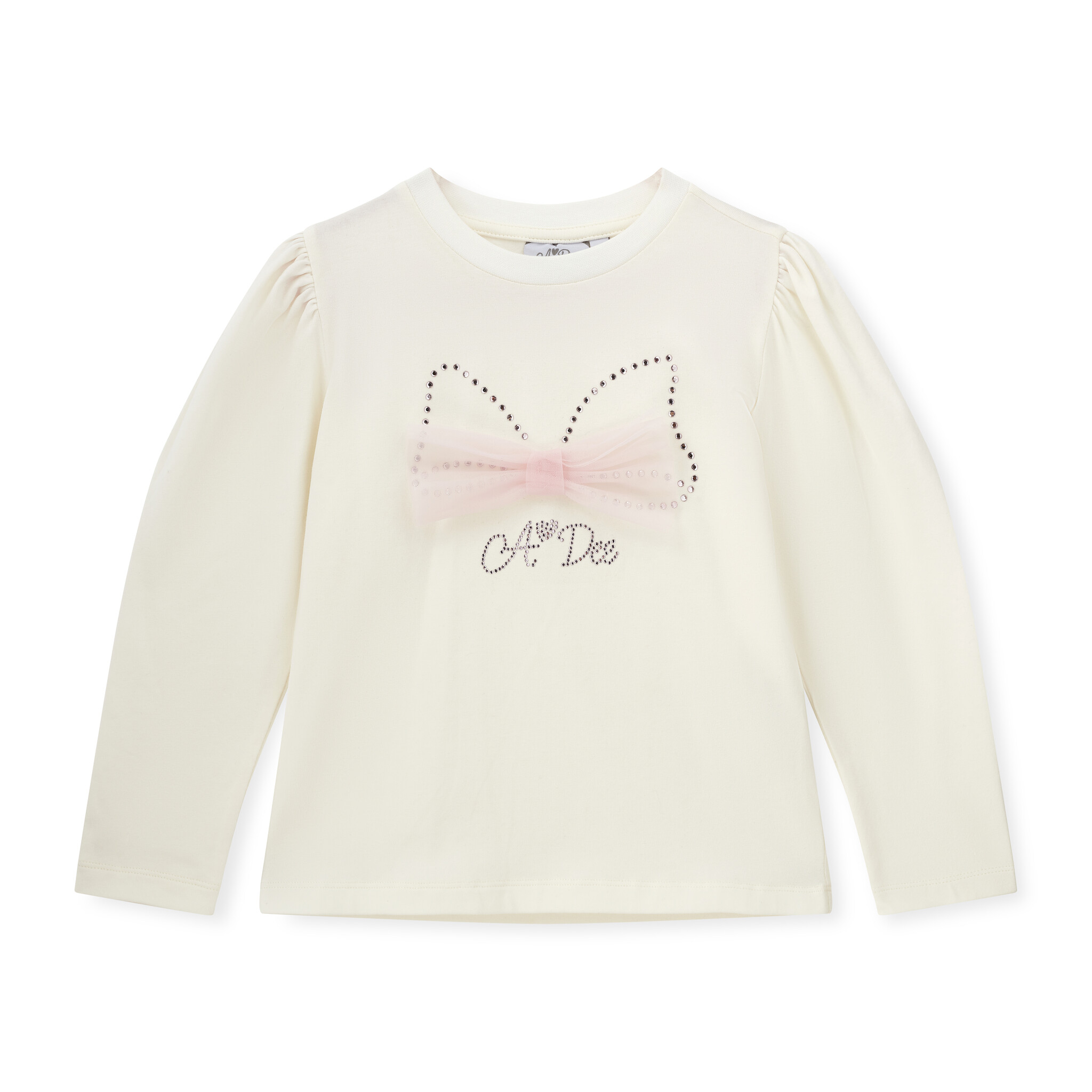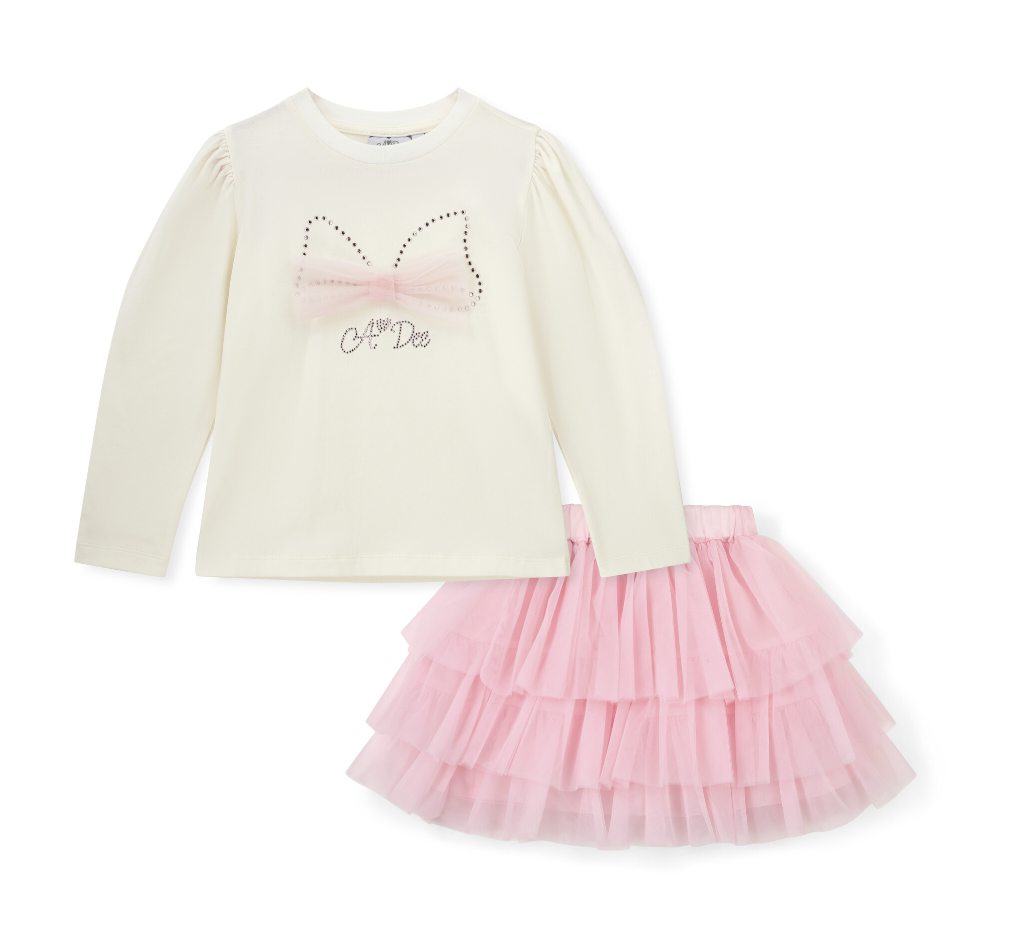 The Mackenzie skirt set features a super cute tulle layered skirt with an elasticated waistband paired with a long-sleeved puff top with the cutest bow detail on the front.