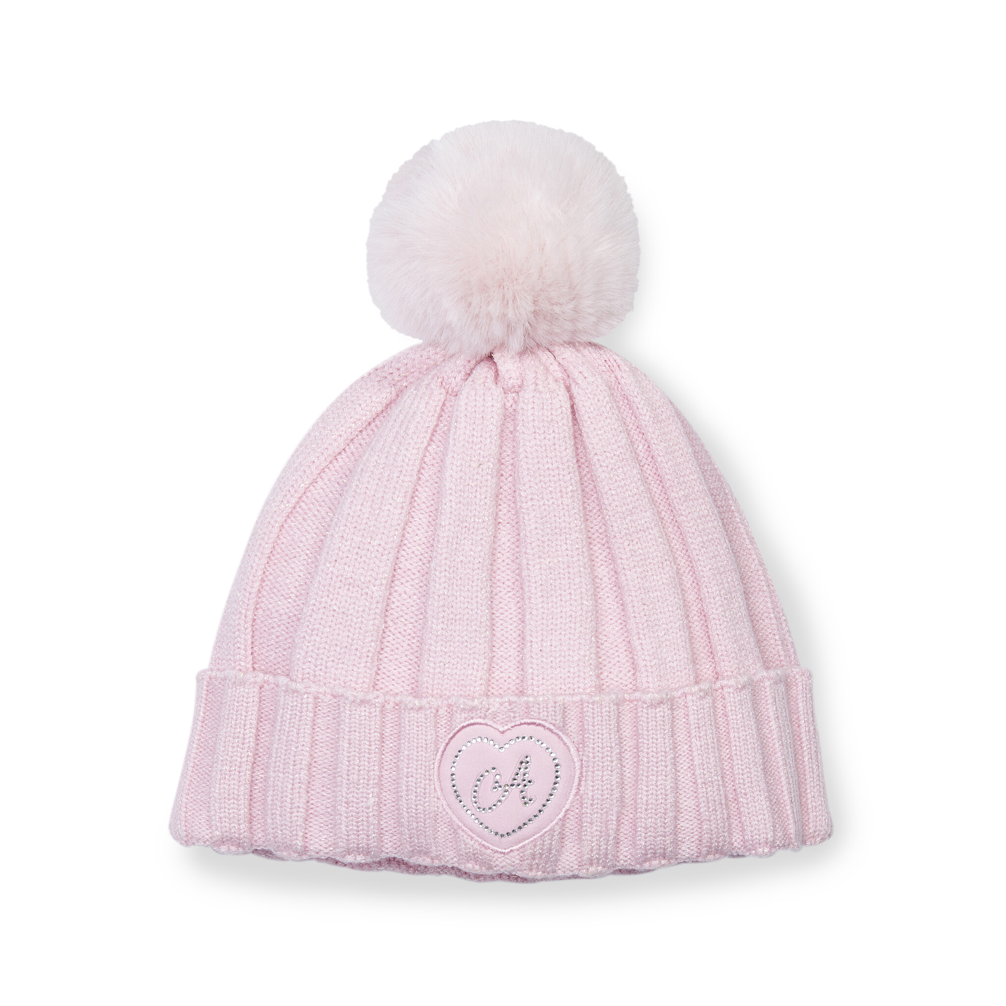 Complete the look with this knitted hat with faux fur pom pom and diamante branded artwork.