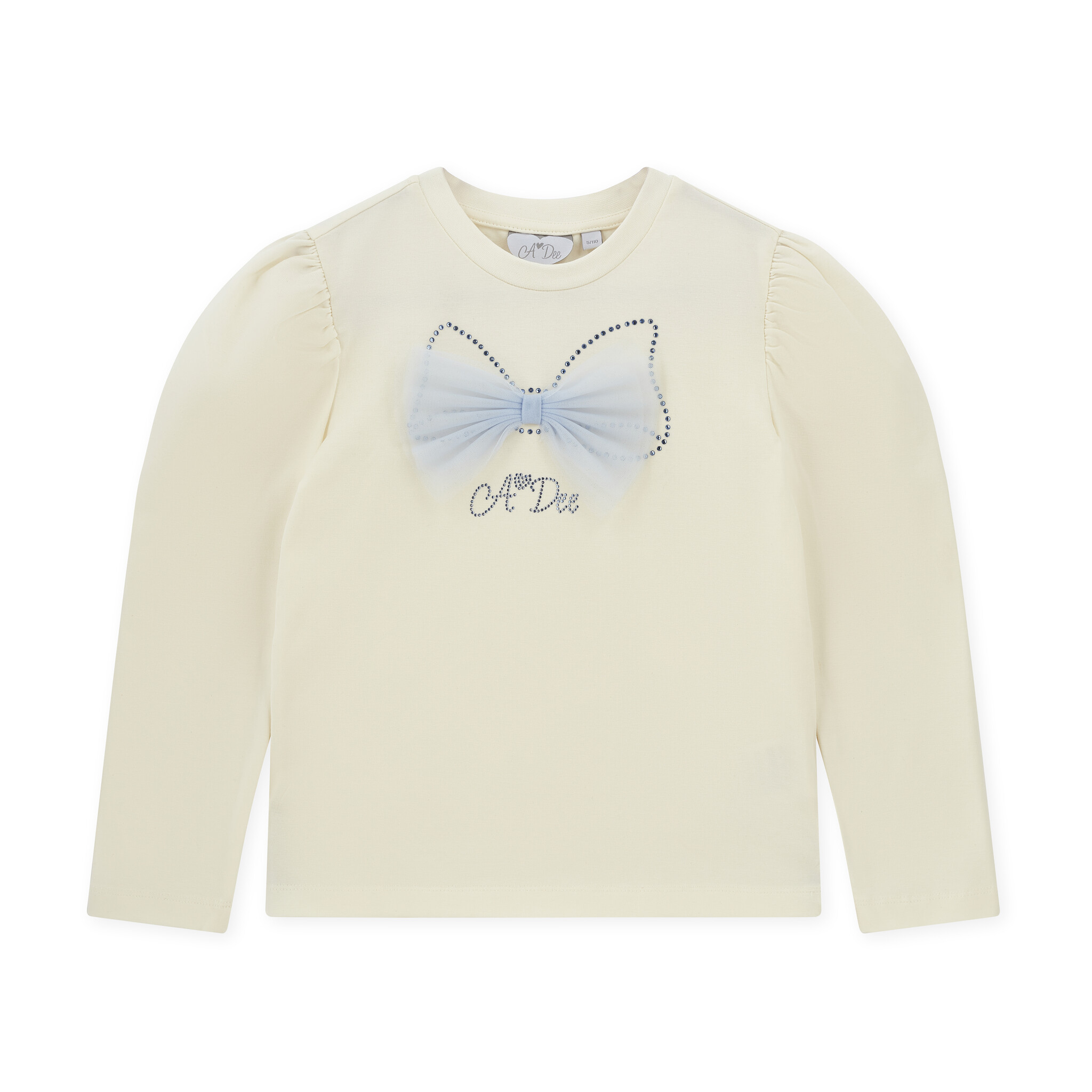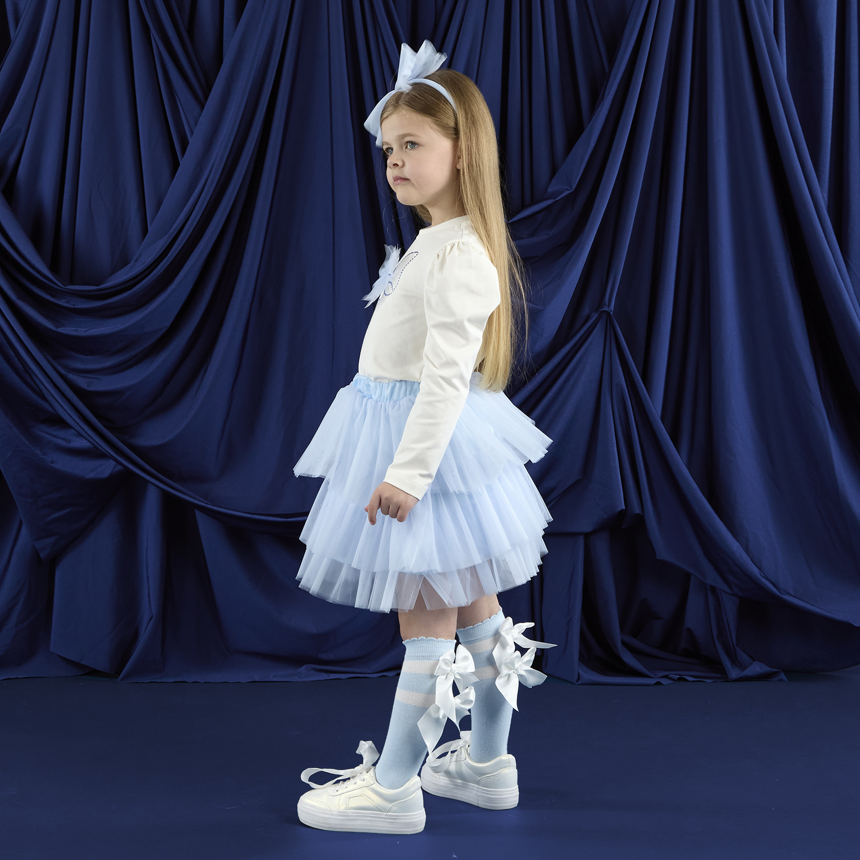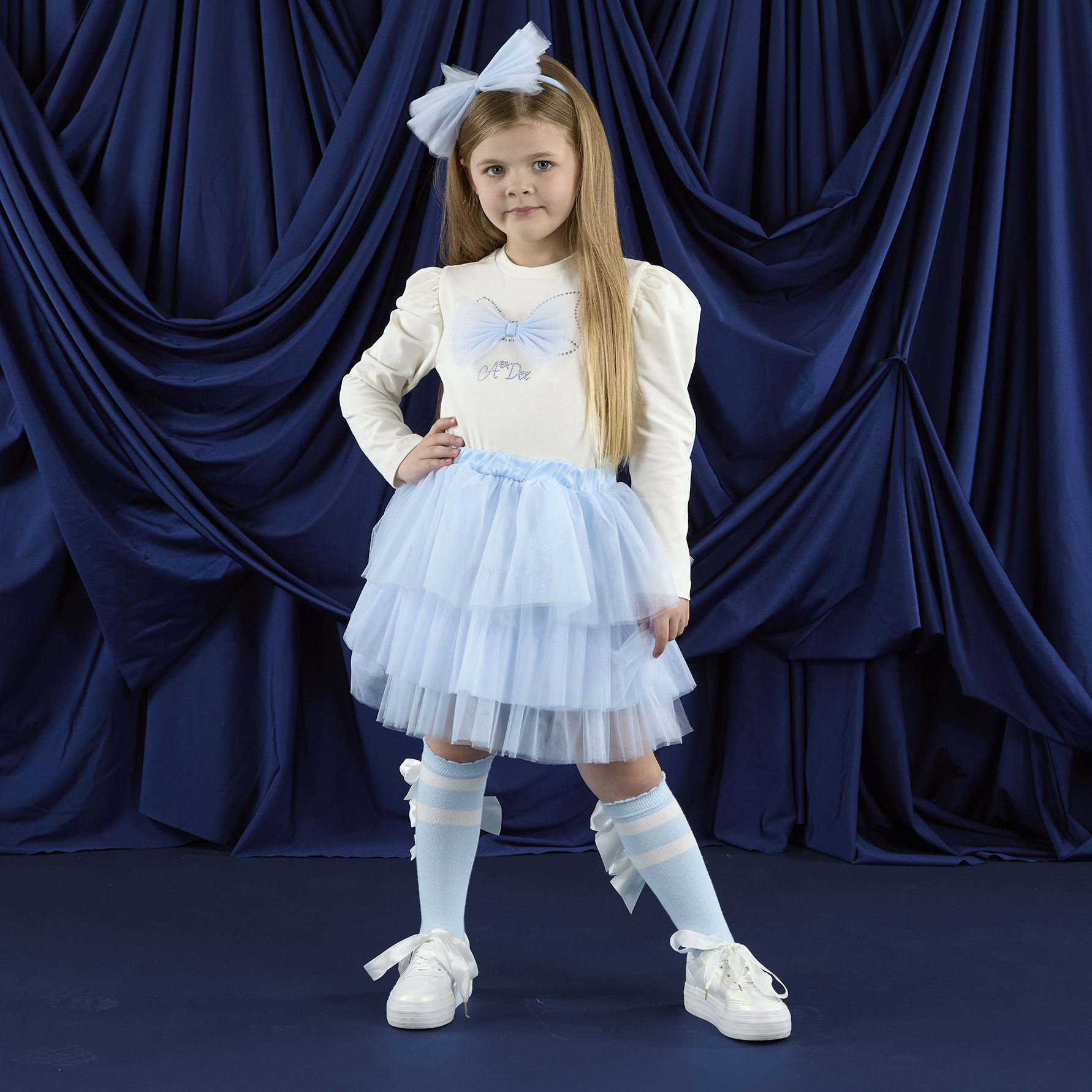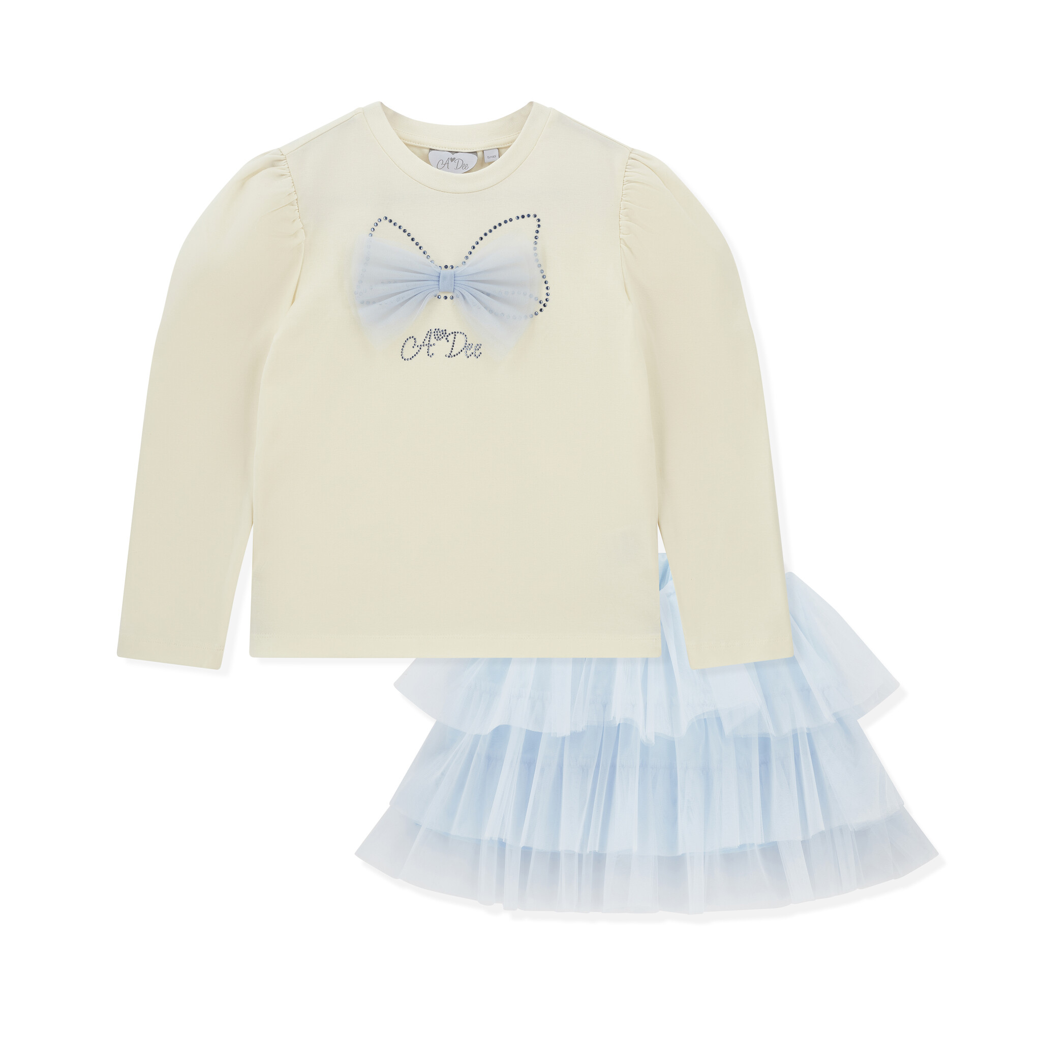 The Naya set features a bold tulle layered skirt, paired with a long sleeve top with a super cute bow artwork on the front.