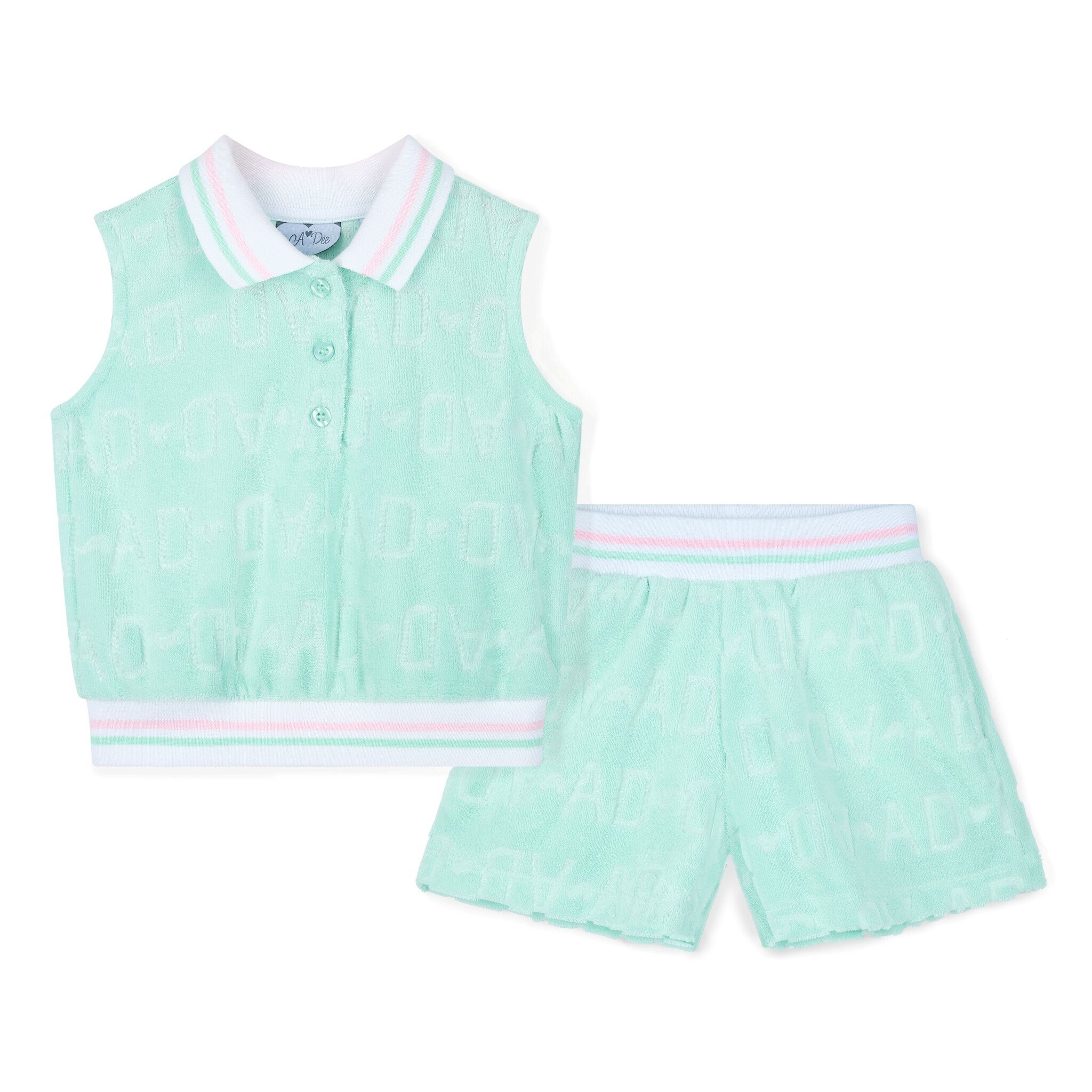 The Romi set is made from branded terry toweling fabric and comes with a sleeveless top and matching short.
