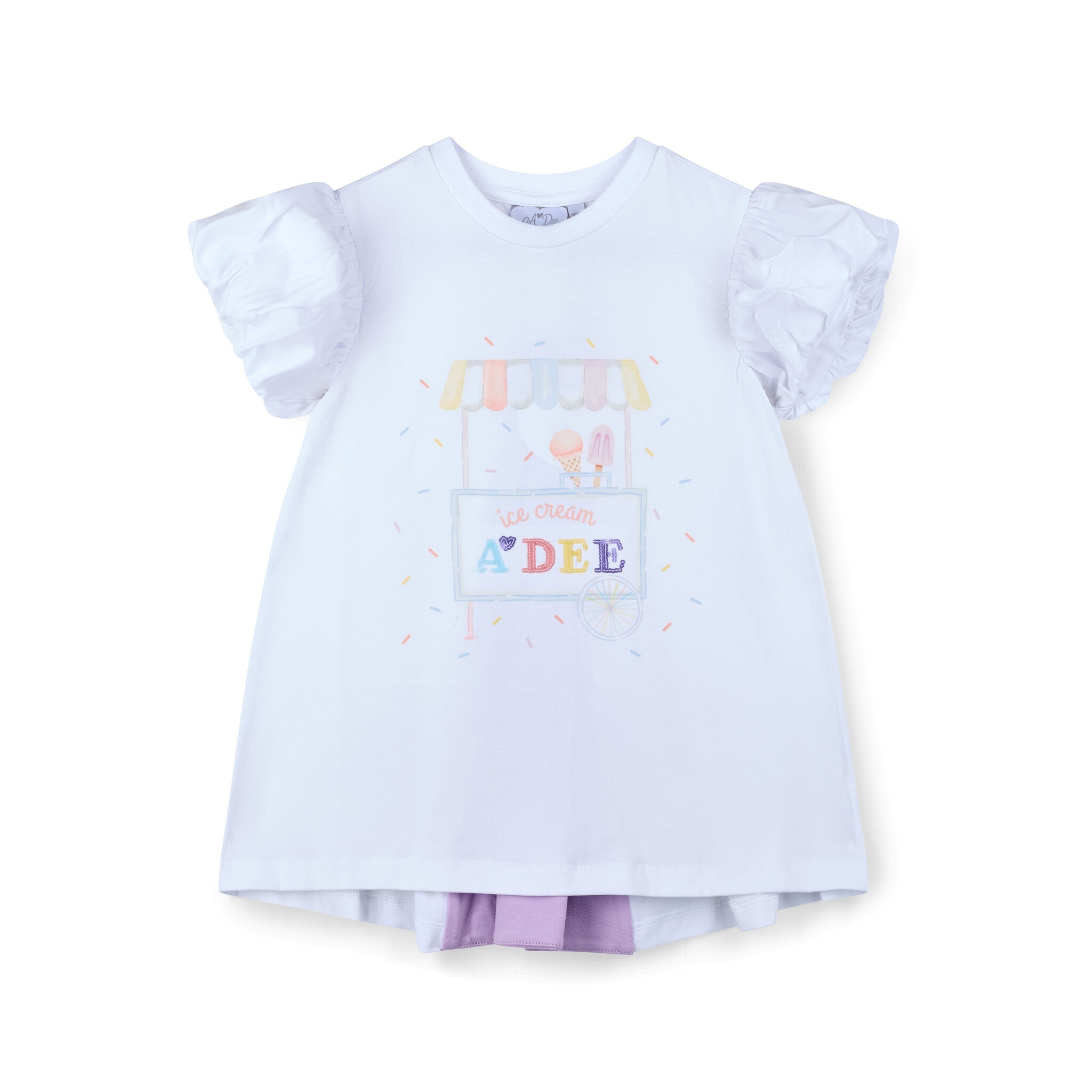 The Skyler legging set features a white tunic top with an ice cream artwork and puff sleeves. Paired with purple leggings which are finished with two applique bows at each ankle.