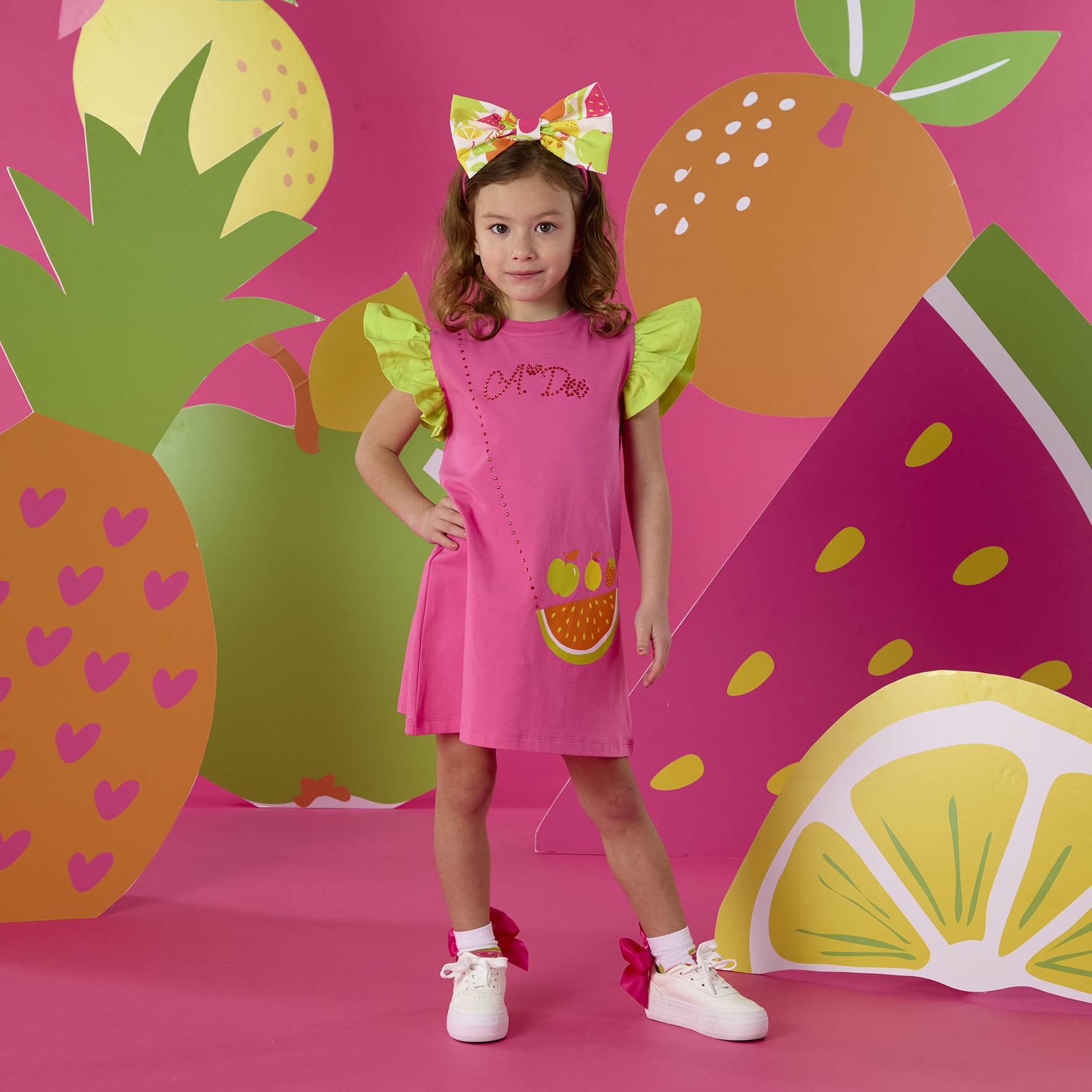 The Tegan dress is made from soft cotton featuring contrast frilly sleeves and a handbag artwork on the front.