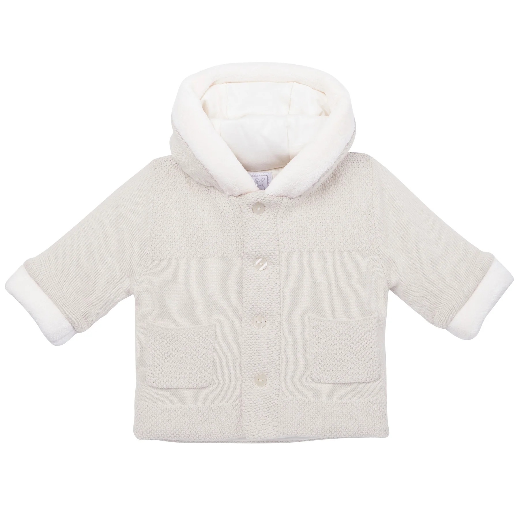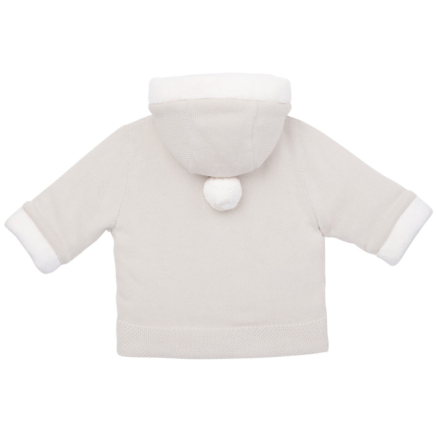 This beautiful knitted, hooded jacket is a super cosy alternative to a coat. In our new colour stone, the main body of the jacket is a textured knit pattern and fine knit combination across the yoke, jacket edges and little pockets. Ivory fur trims the sleeve and hood which also has a fun fur pom-pom. Fastened by four pearlised buttons, wadded and lined with cotton for cosiness, this will keep baby toastie.