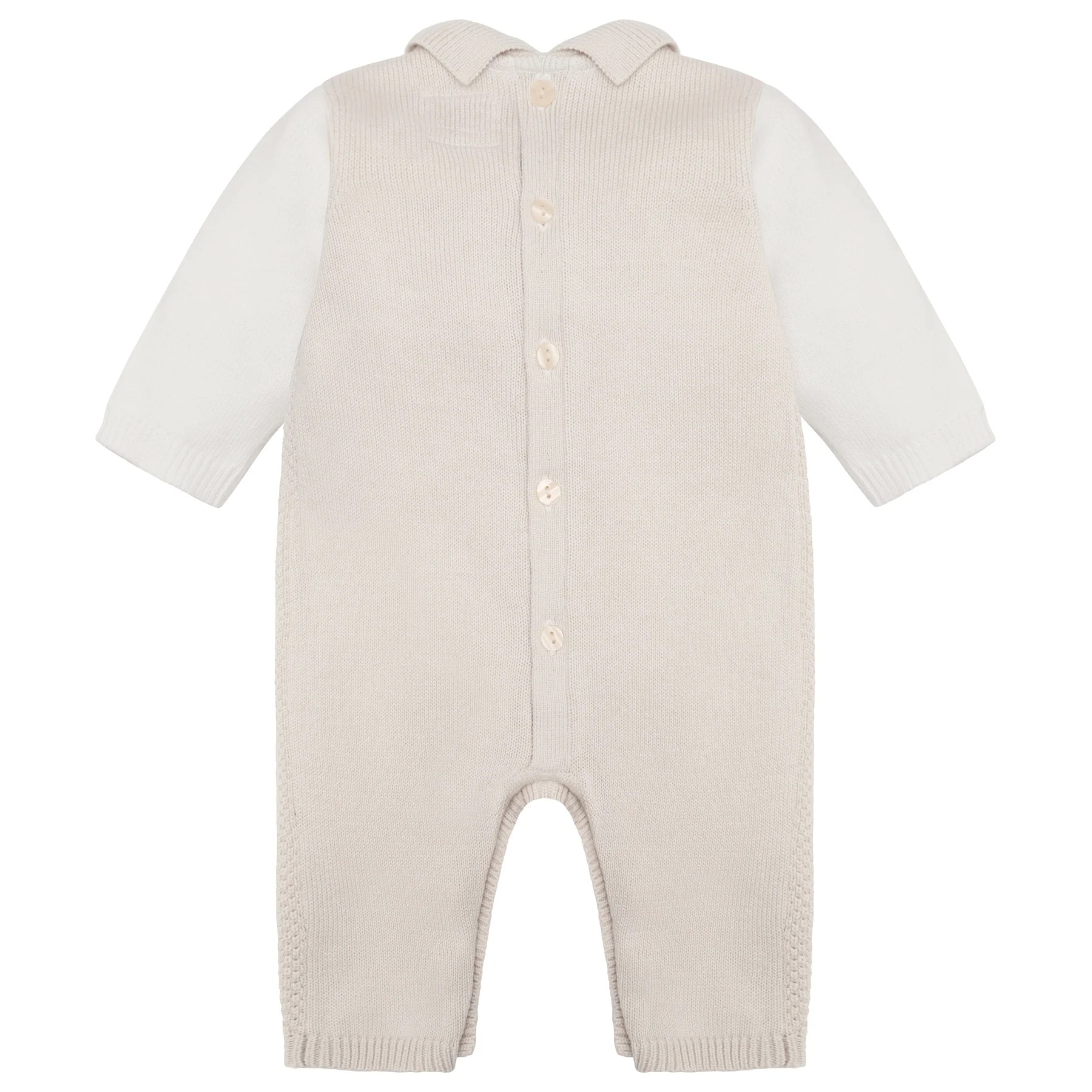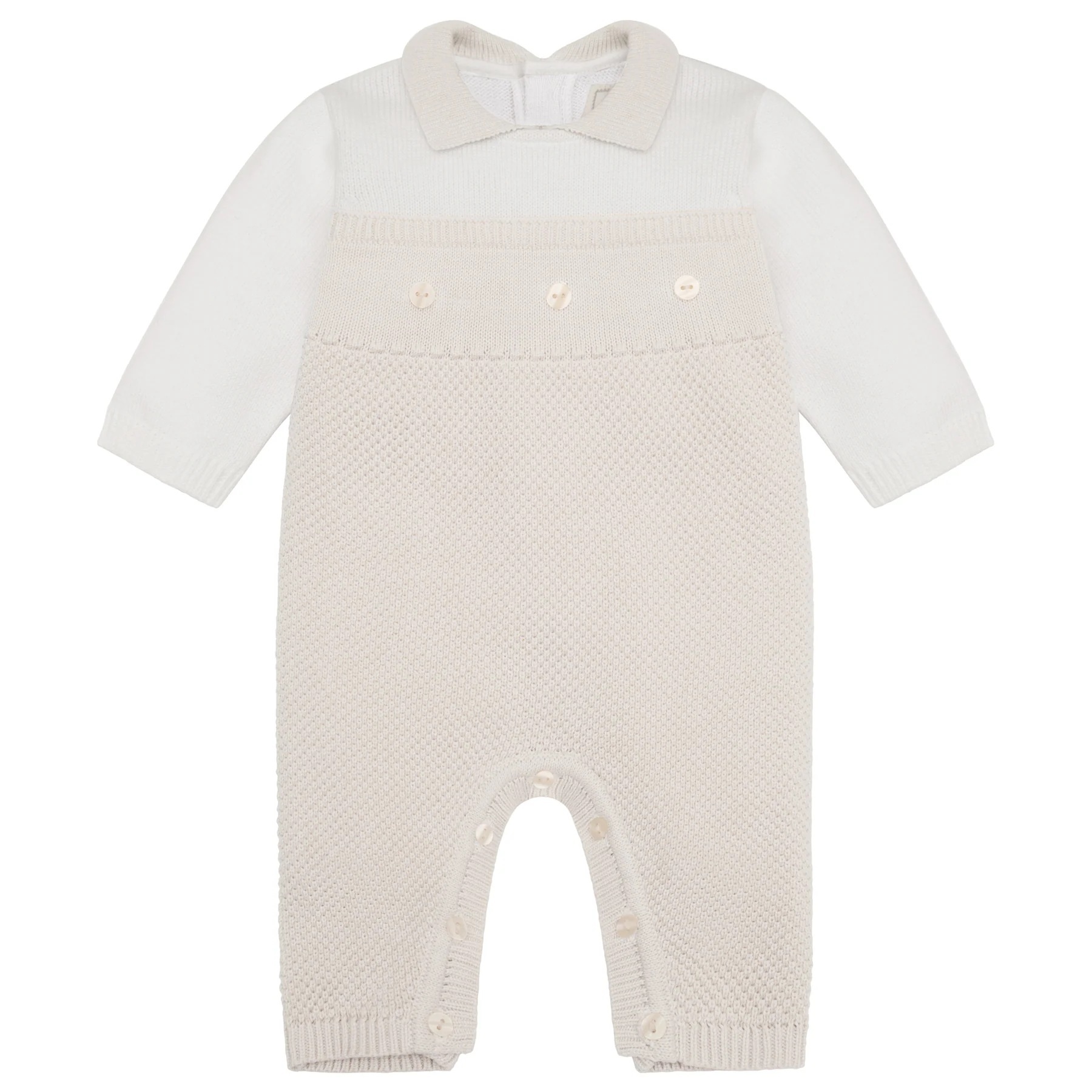 Introducing Kenzie, different textured knit is the key feature to this lovely all in one. New for this season in stone, this garment is perfect for the transition from autumn to winter. Beautifully knitted contrasting white top and sleeves, stone collar and pearlised buttons across the chest, this garment is just the thing for a leafy autumn walk!Finer Details: