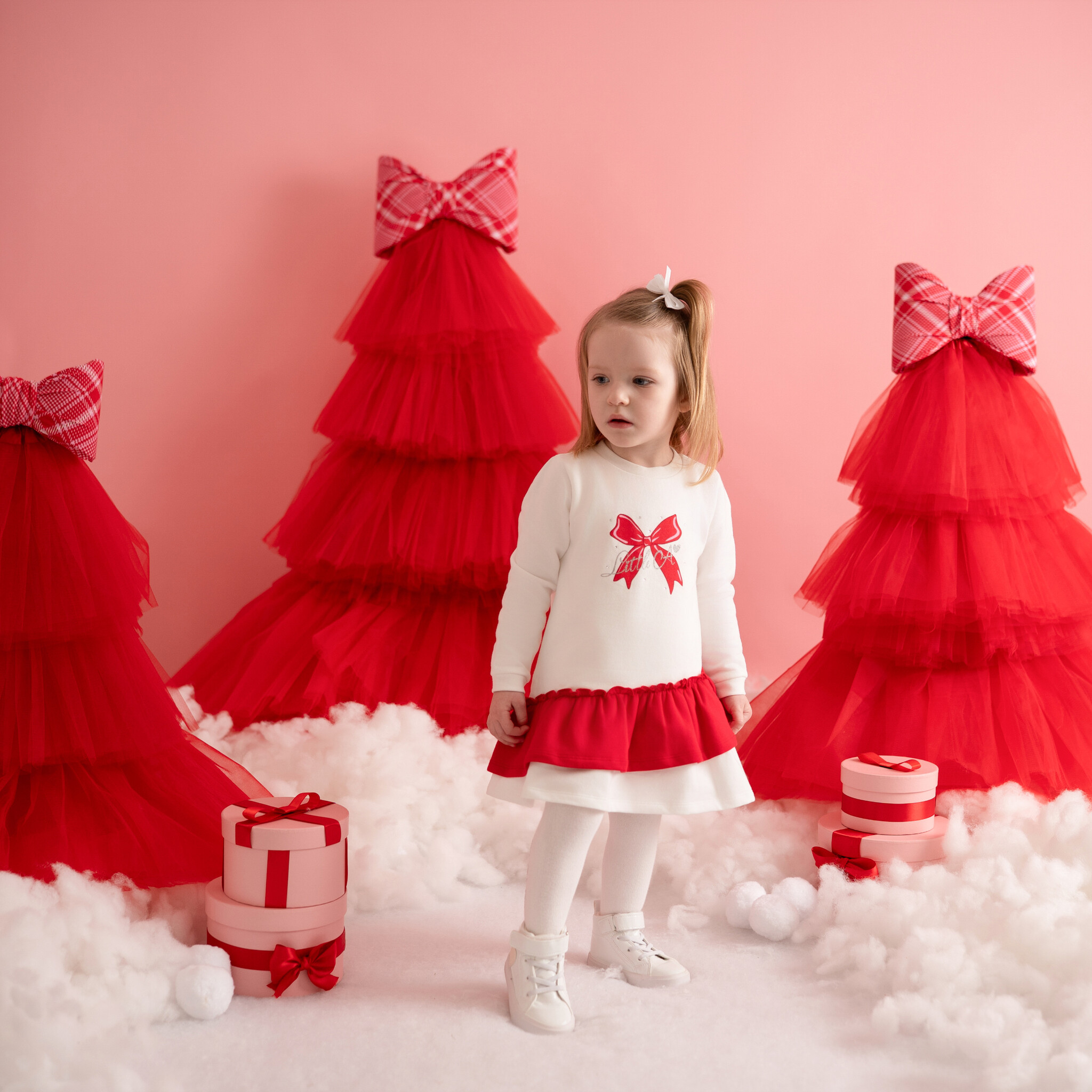 The Katrina dress is perfect for winter parties. Featuring a beautiful bow artwork at the front and finished with a contrast frill detail across the front.