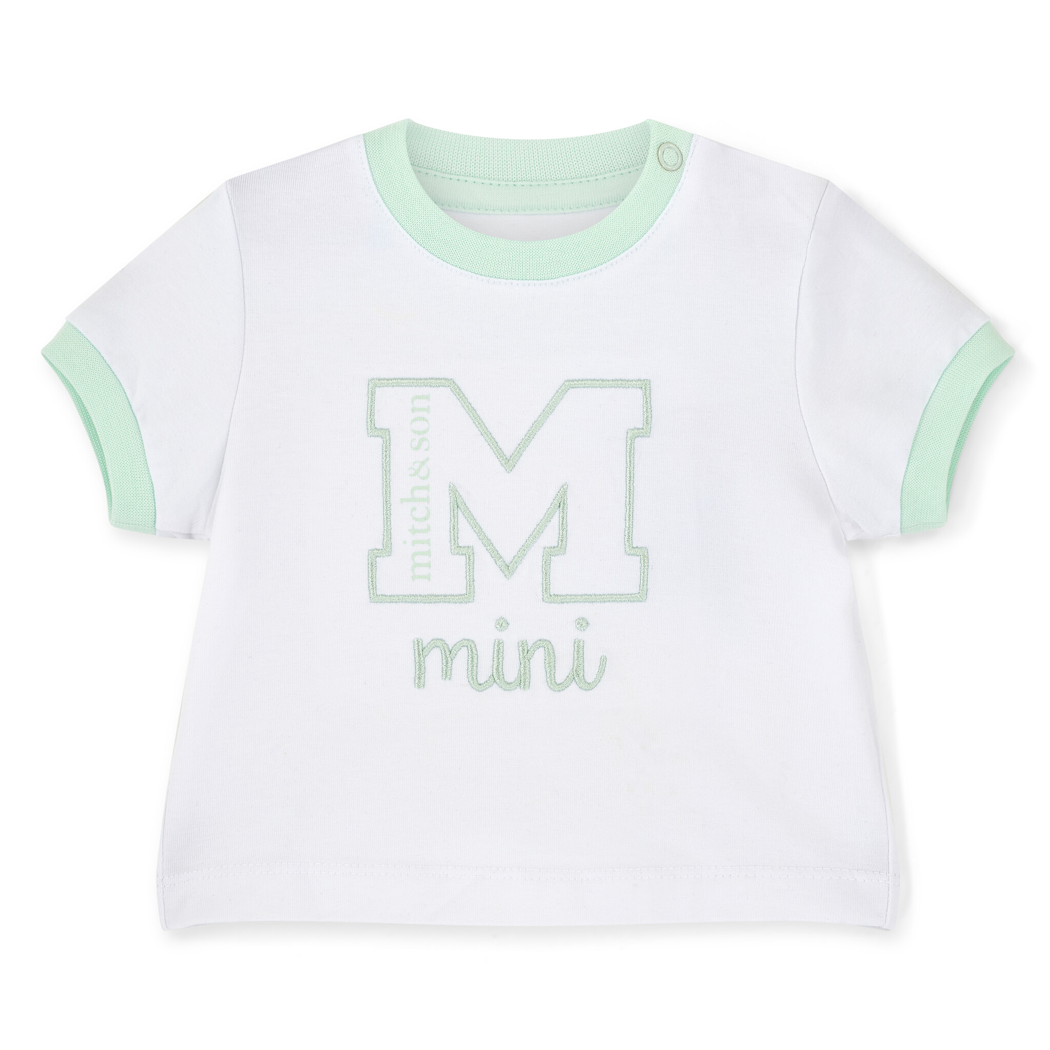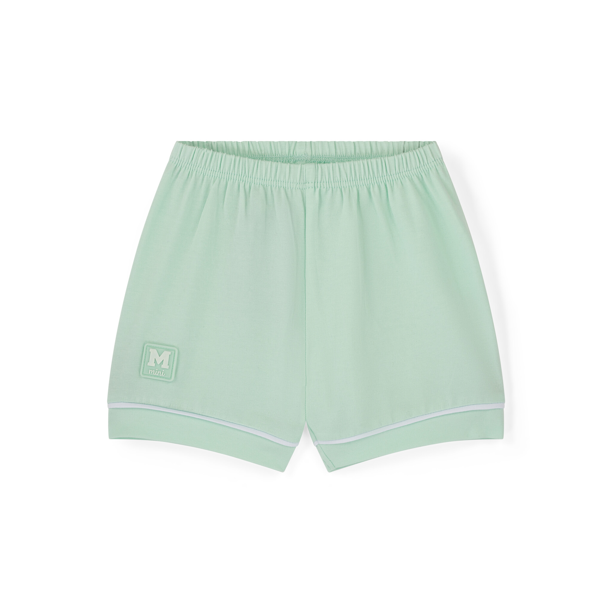 The Nico set features a soft jersey top with contrast *blue/green* cuffs and collar finished with classic branding on the front. Paired with matching *blue/green* soft jersey shorts.
